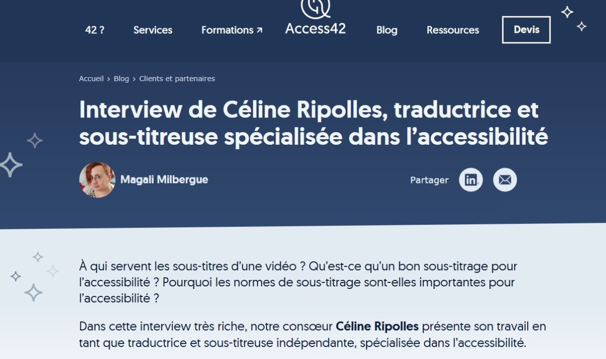 J'ai eu l'honneur d'être interviewée par Magali Milbergue, experte accessibilité chez Access42, sur le sous-titrage accessible.